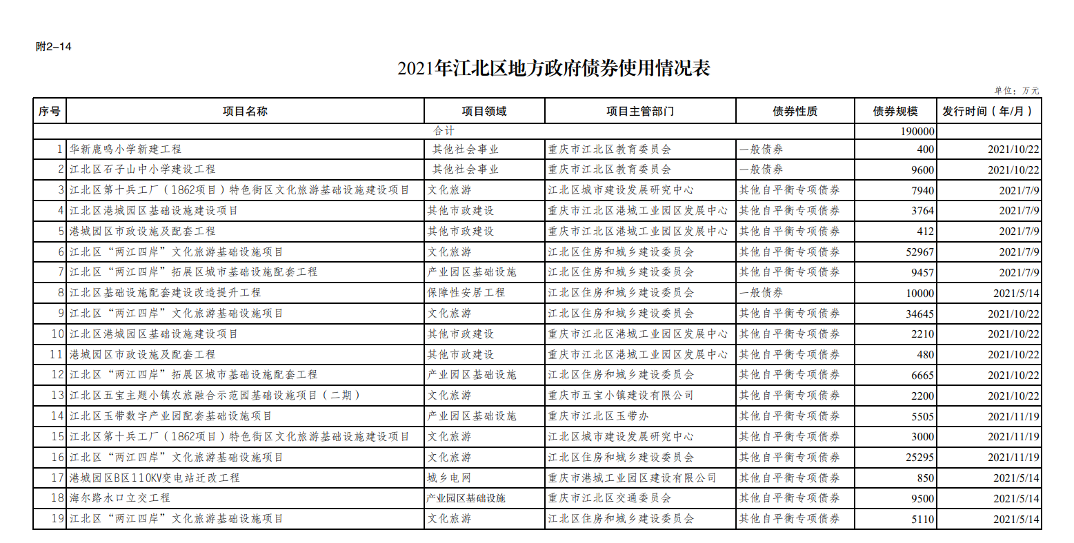 重慶市江北區人民政府關于江北區2021年決算的報告(2021年地方政府債券使用情況)