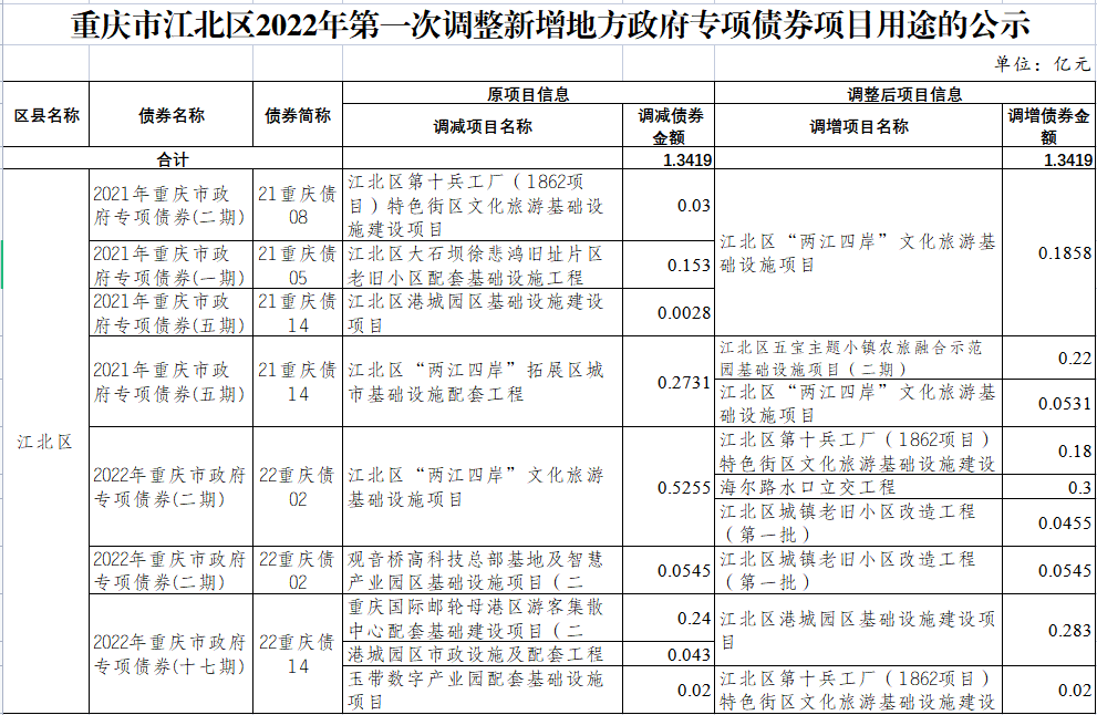 重慶市江北區(qū)2022年第一次調(diào)整新增地方政府專項債券項目用途的公示