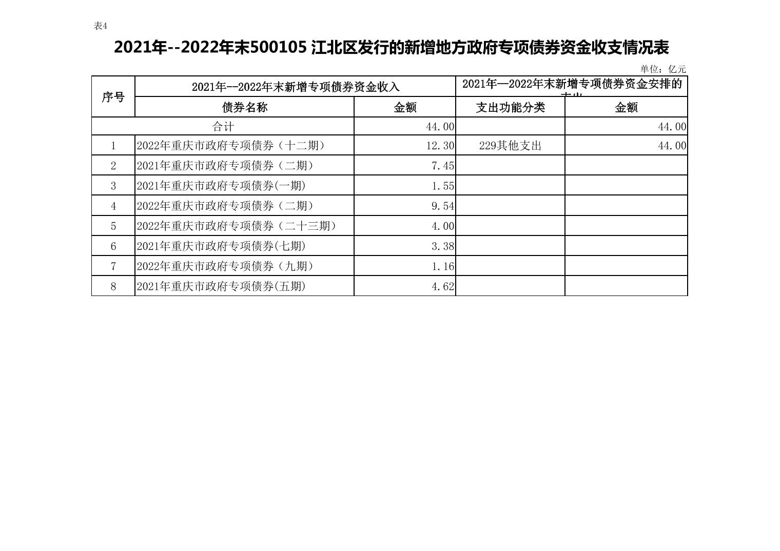 2021年--2022年末500105 江北區發行的新增地方政府專項債券資金收支情況表