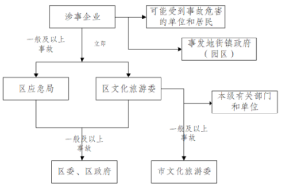 (3)及時向區(qū)政府、市文化旅游委報告本單位管理范圍內發(fā)生的突發(fā)事件(故),配合區(qū)政府、市文化旅游委在本單位管理范圍內發(fā)生的較大、重大、特別重大突發(fā)事件(故)的處置工作;