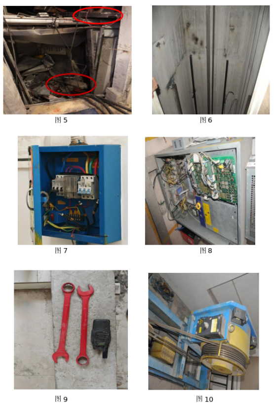 (2)轎廂位于井道底部,部分變形,轎門、轎壁、轎頂存在明顯破拆痕跡,轎廂內(nèi)有部分對重塊(圖4、圖5);
