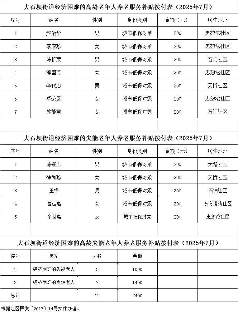 大石壩街道2025年7月經濟困難的高齡和失能老年人養老服務補貼撥付表