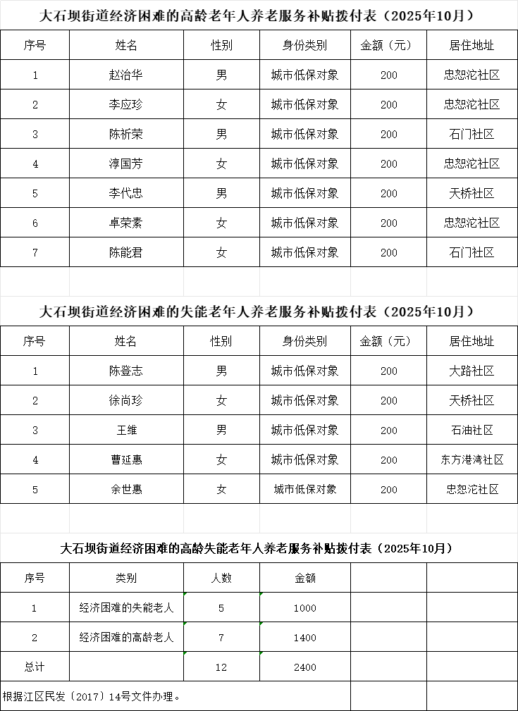 大石壩街道2025年10月經濟困難的高齡和失能老年人養老服務補貼撥付表